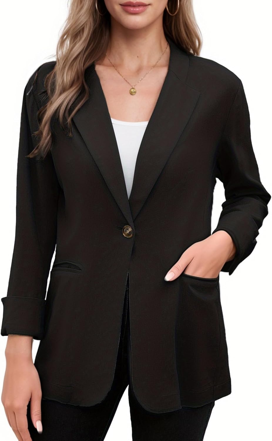 Women's One Button Cotton Linen Blazer Lightweight 3/4 Roll Up Sleeve Jacket for Casual Dailywear Office