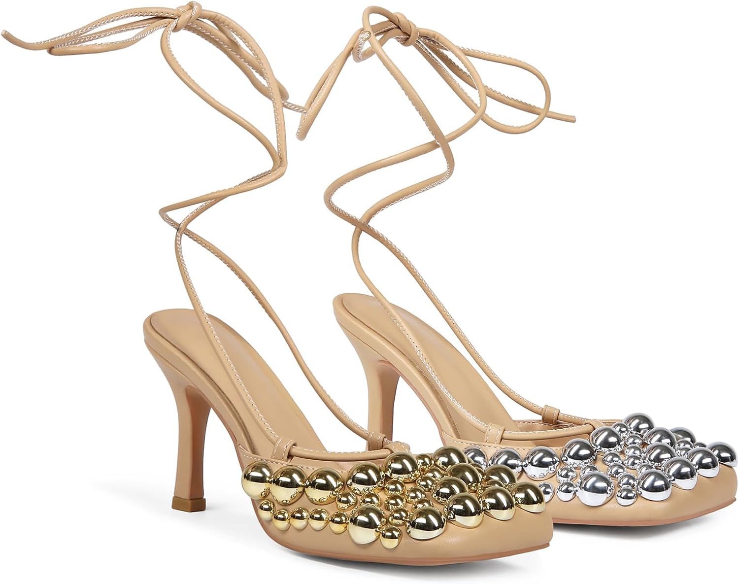 Saint Leia Women's 4IN High Heel Sandals Nude Stiletto Pumps with Gold Silver Pearls Heels for Weddings Parties and Evening Wear
