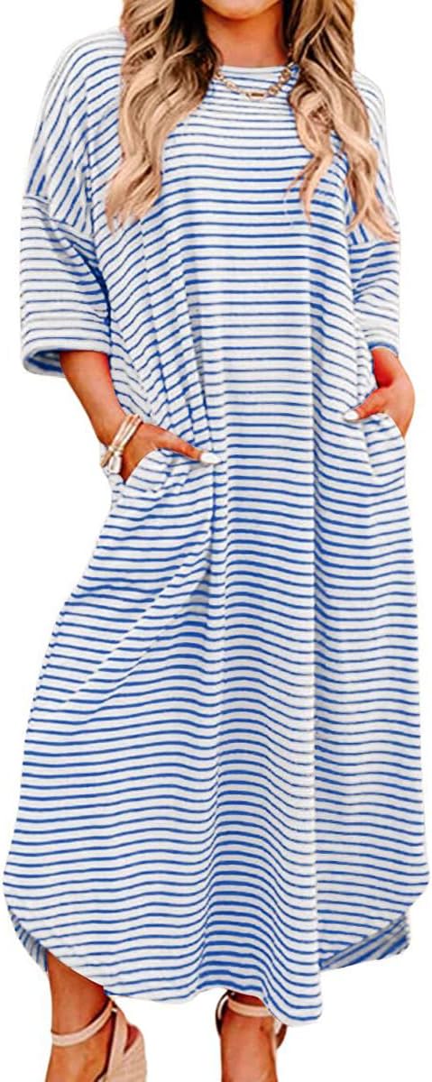 chouyatou Women's Contrast Color Striped T-Shirt Dress Casual Loose Short Sleeve Midi Long Beach Dress
