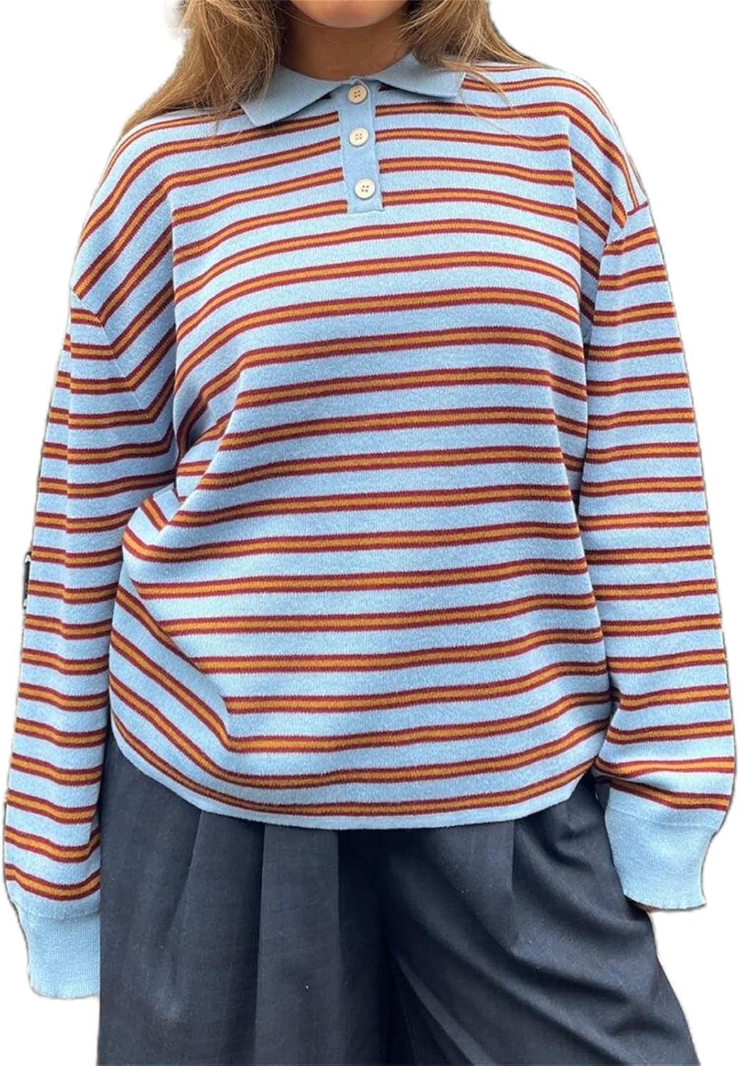 Women Y2k Striped Rugby Polo Shirt Knit Vinatge Tops Long Sleeve Button Collared Neck Preppy Pullover Sweatshirt