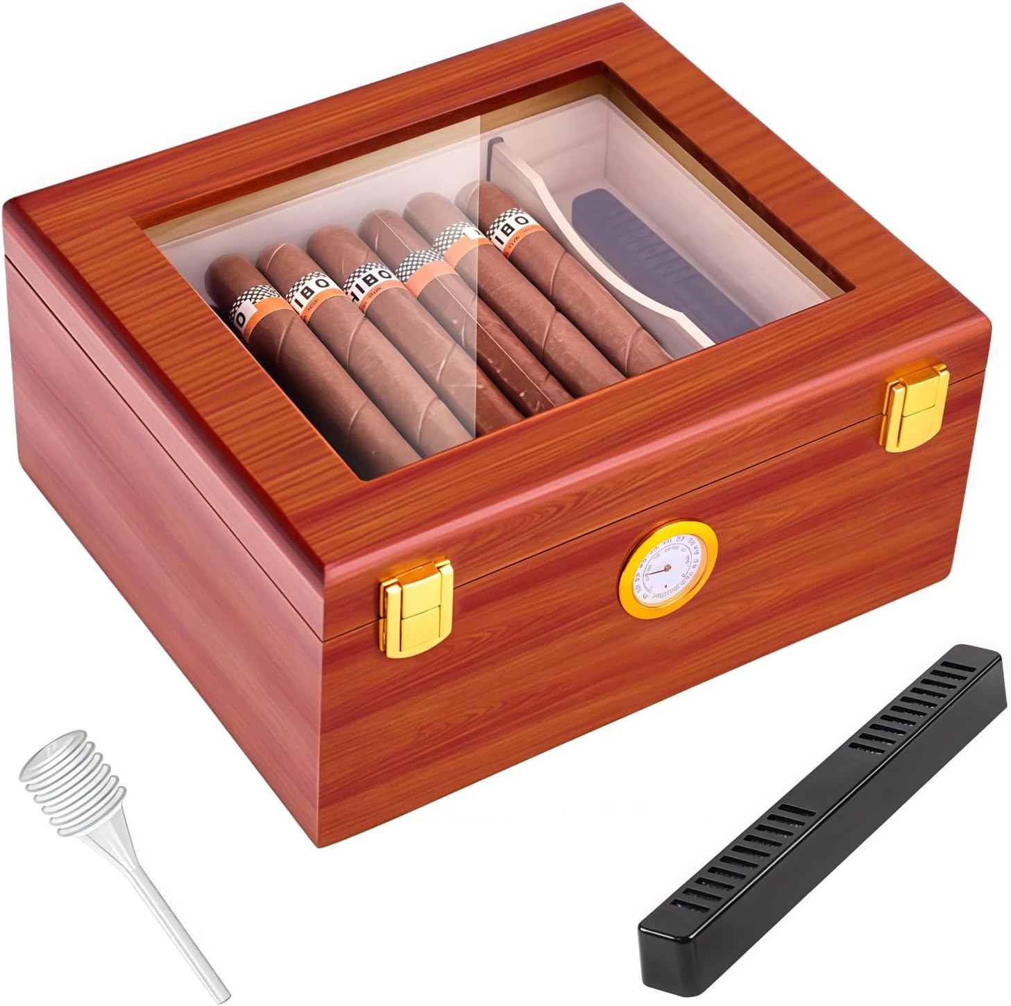 - 【Exquisite Craftsmanship】The surface of the cigars humidors is made of baking lacquer, simple and high-grade, wear-resistant and polished. Scratch-resistant velvet bottom prevents scratching of cigar storage box. The gilded hinge is smooth, and the golden lock adds a touch of luxury to the humidor. The large glass display window on the top combines practicality and aesthetics. The overall appearance is exquisite, humidors for cigars 25-50. This wood cigar box kit is ideal cigar cases for men