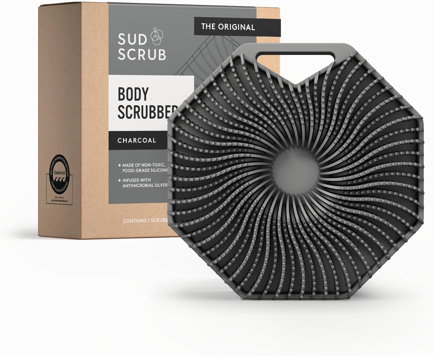 Sud Scrub® Antimicrobial Silicone Body Scrubber, Exfoliating Body Scrubber for Sensitive Skin, Eco Friendly Shower Scrubber for Body, Silicone Body Brush for Showering, Charcoal