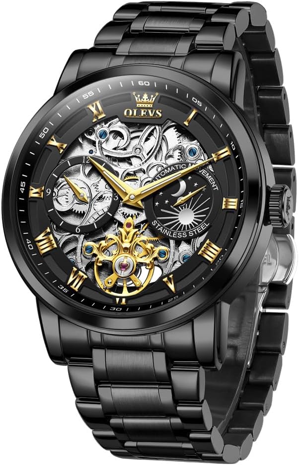 OLEVS Automatic Men Watch Self Winding Mechanical Moon Phase Business Luxury Diamond Dress Stainless Steel Waterproof Luminous Mens Wrist Watch