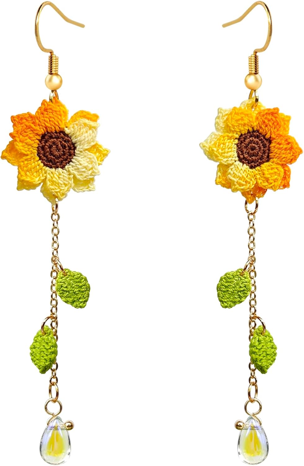 Crochet Sunflower Flower Dangle Earrings for Women Handmade Crochet Flowers Cute Blossom Fairy Dainty Refreshing Floral Long Dangling Earrings for Women Trendy-Summer Boho Beach Jewelry