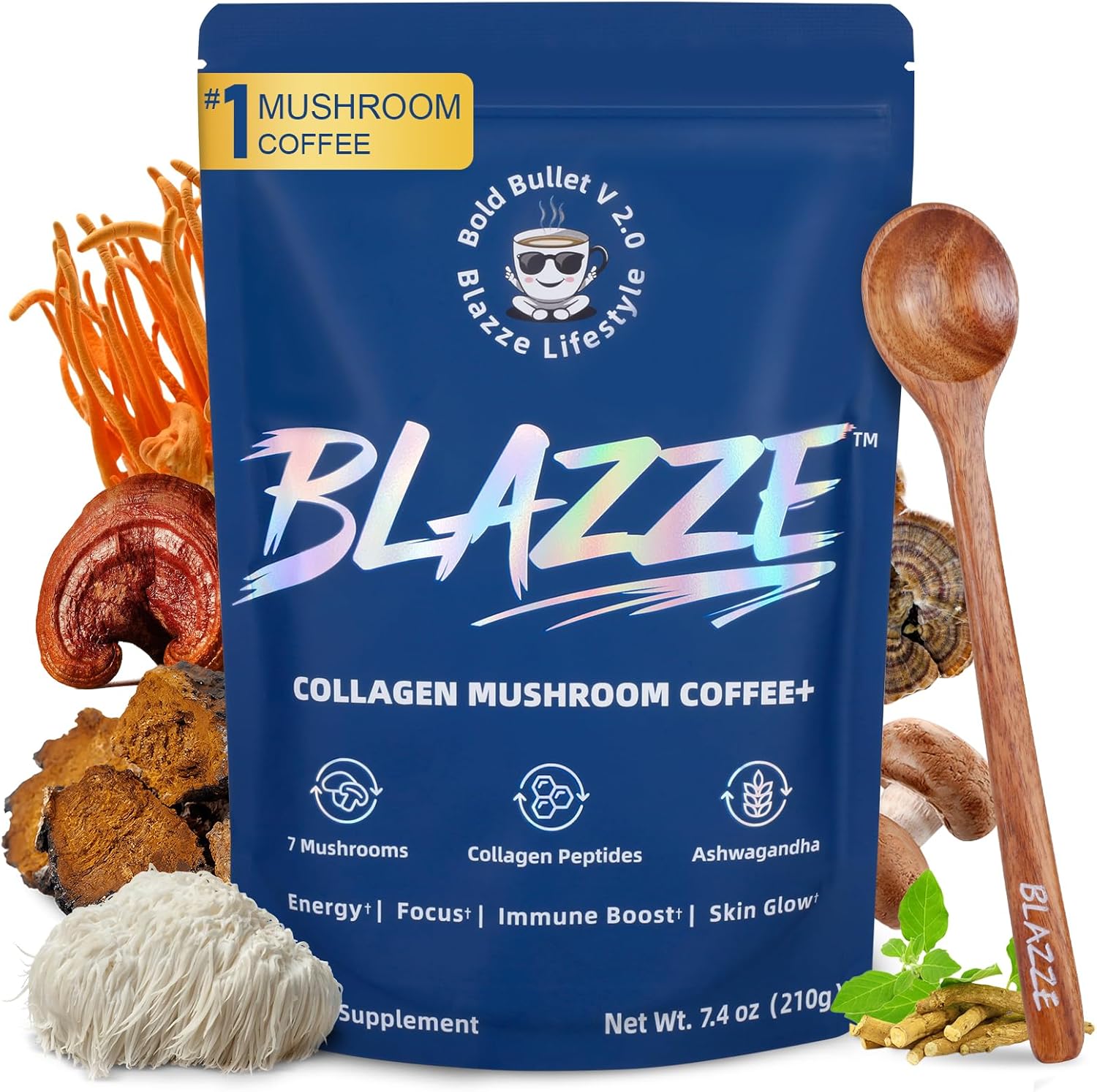 BLAZZE Mushroom Coffee with Collagen,100% Fruiting Body Extract,Adaptogenic 7 Mushrooms with Organic Reishi, Lion's Mane,Ashwagandha,Instant Coffee for Focus, Energy & & Immune Support–30 Servings