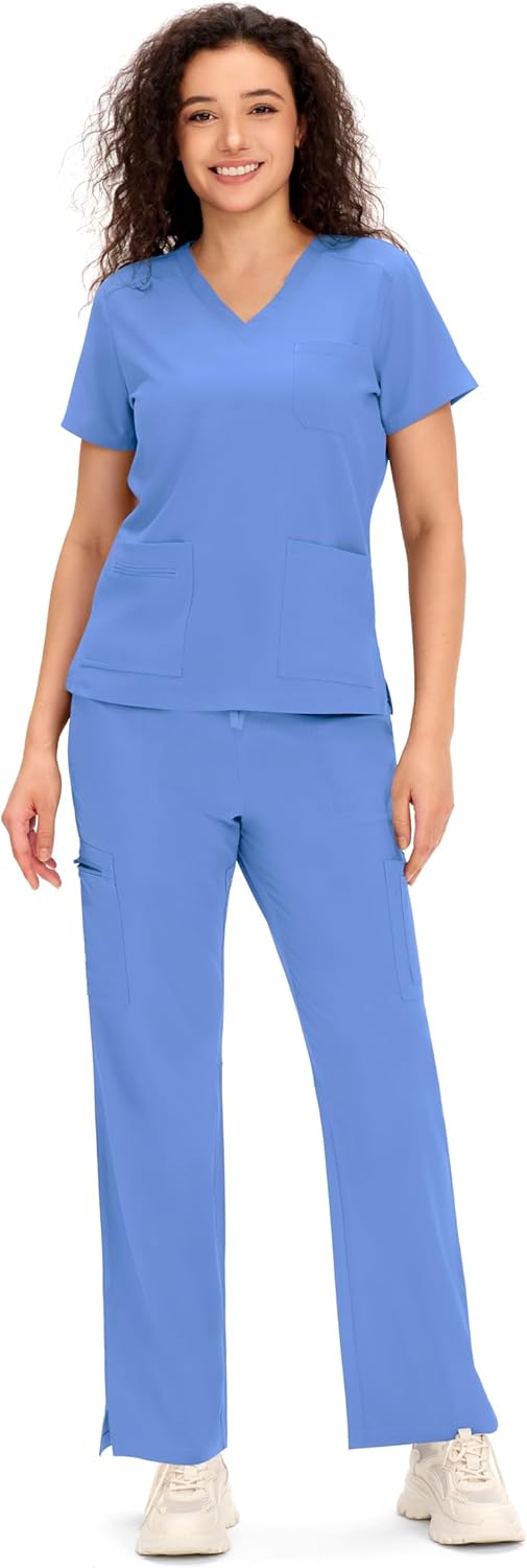 COZYFIT Scrubs for Women - COZY SCRUBS V Neck Top and Bootcut Cargo Straight Pants with 12 Pockets