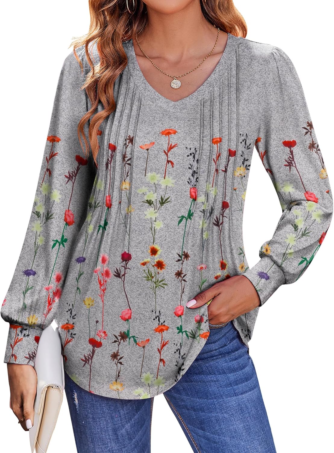 Zeagoo Women's Puff Long Sleeve Shirts Pleated V Neck Fall Tunic Tops Blouse Dressy Casual Summer T-Shirts