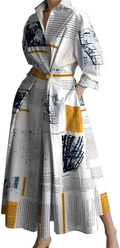 UOOZEE Women's Long Sleeve Maxi Shirt Dress Elegant Lapel V Neck Loose Swing A Line Party Dress with Pockets