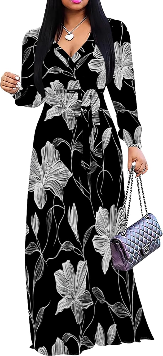 PinkPatty Women's Long Sleeves V Neck Maxi Dresses Flowy Party Wedding Guest Dress with Belted