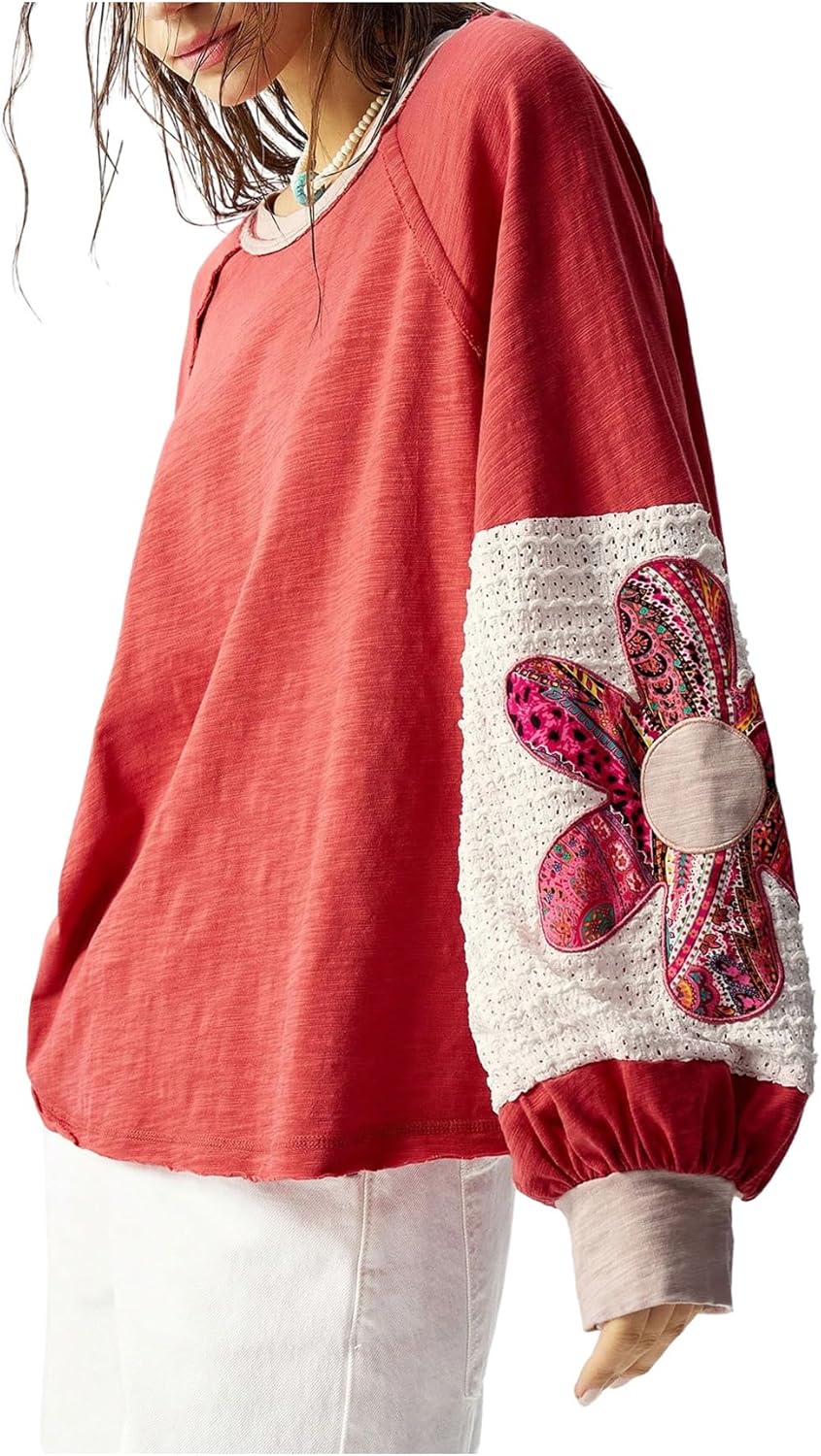 Women's Oversized Sweatshirt Boho Tops Patchwork Crewneck Sweatshirt Floral Long Sleeve Pullover Tops