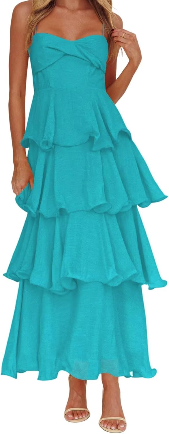 YMSHA Tiered Chiffon Bridesmaid Dress Ruffles Spaghetti Straps Long A-line Beach Formal Maxi Dresses CLN100