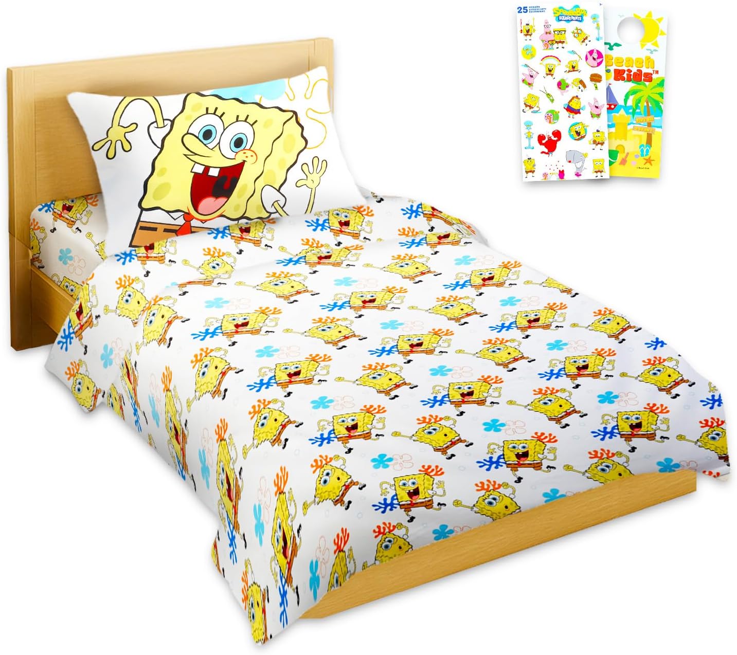 - Officially licensed Spongebob sheet and pillowcase set also includes Spongebob stickers and a Beach Kids door hanger.