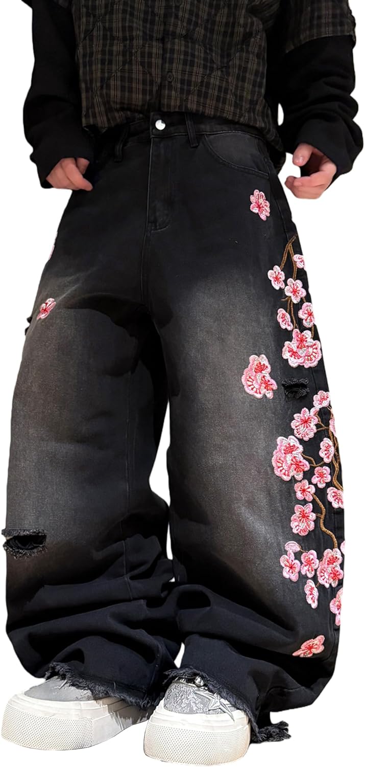 Men's Baggy Jeans Blossom Embroidery Pattern Wide Leg Y2K Jeans Mid Rise Denim Pants Streetwear