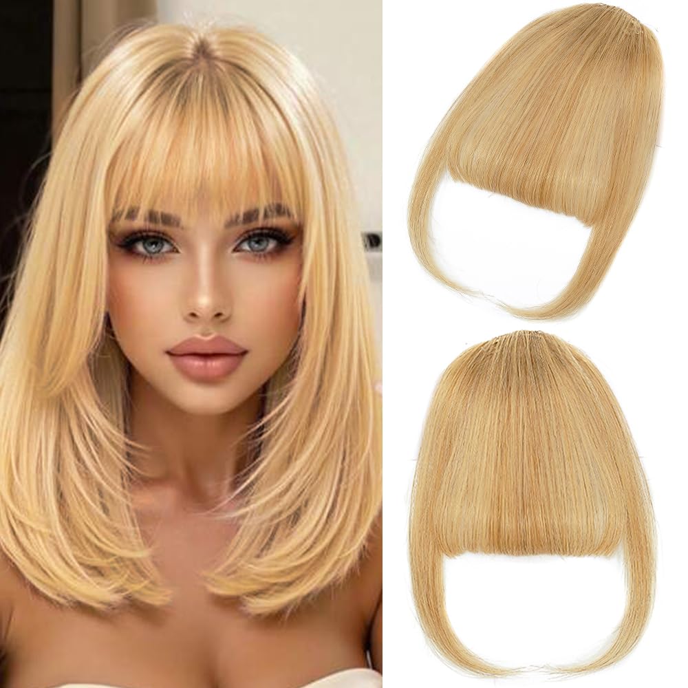 Clip in Bangs, 100% Real Human Hair Wispy Fake Bangs Hair Clip for Women Ash Blonde Natural Curtain Fringe with Temples Hairpieces for Daily Wear (Wispy Bangs, Ash Blonde)