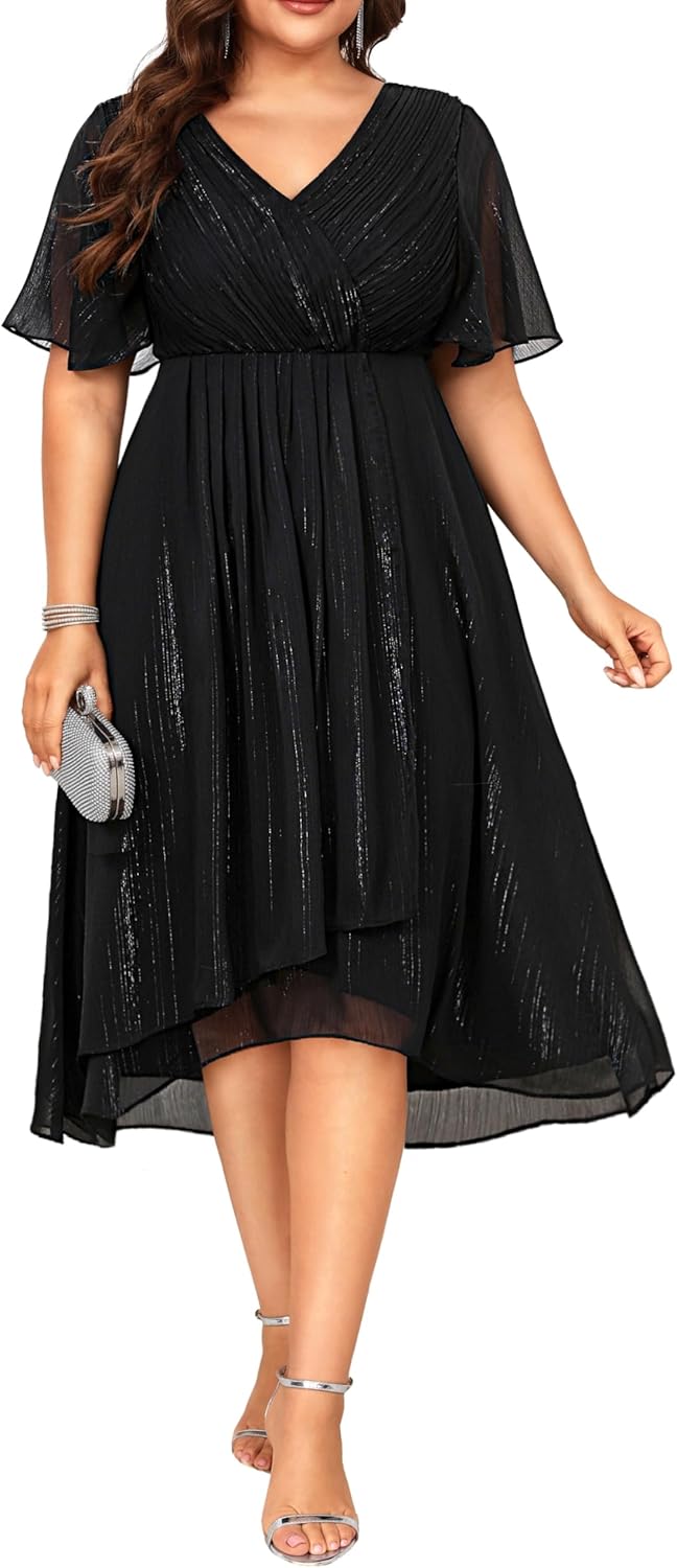Plus Size Cocktail Dress - Formal Wedding Guest Fall Long Sleeve A Line Pleated V Neck Midi Dresses for Curvy Women