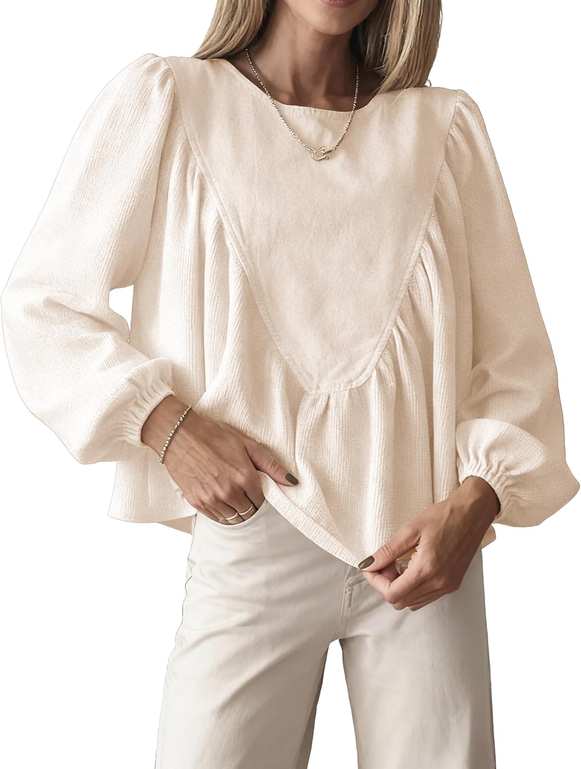 Women's Peplum Babydoll Top Waffle Knit Shirt with Back Button Lantern Sleeves for Casual Outfits