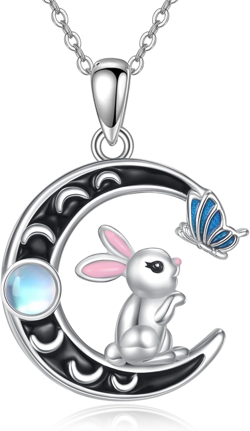 Bunny Necklace 925 Sterling Silver Crescent Moon Rabbit Pendant With Moonstone For Women Bunny Jewelry Gift