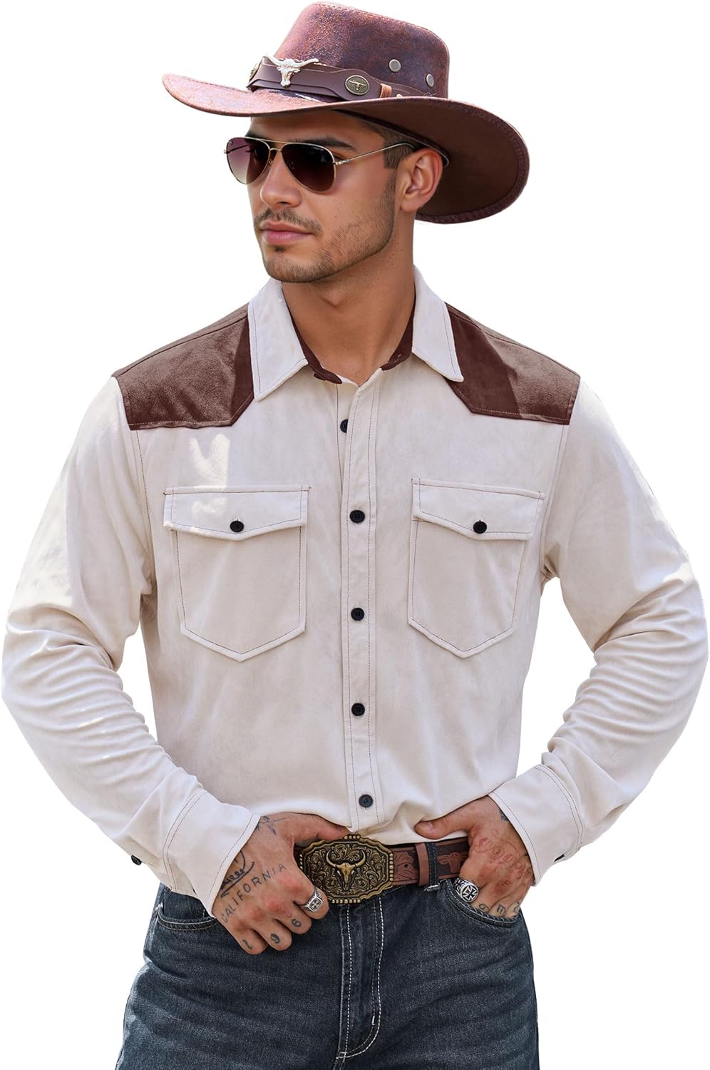 Men's Western Shirt Cowboy Soft Faux Suede Casual Button Down Shirt with Flap Pockets (S-2XL)