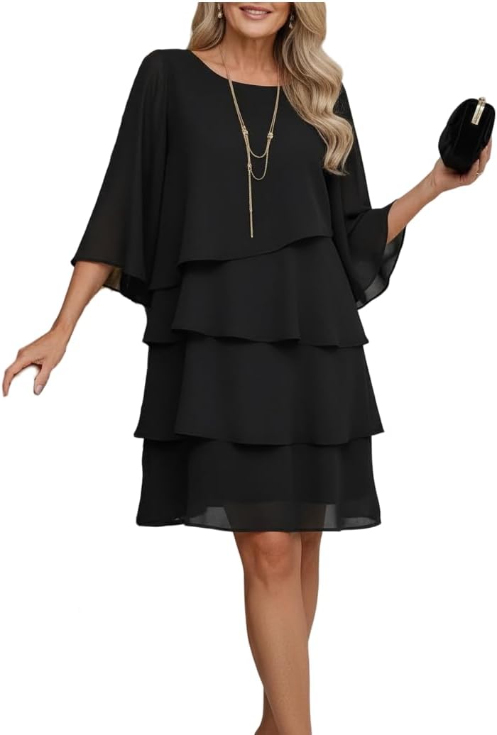 Women's Chiffon Midi Dress 3/4 Bell Sleeve Crewneck Tiered Layered Elegant Wedding Guest Dresses