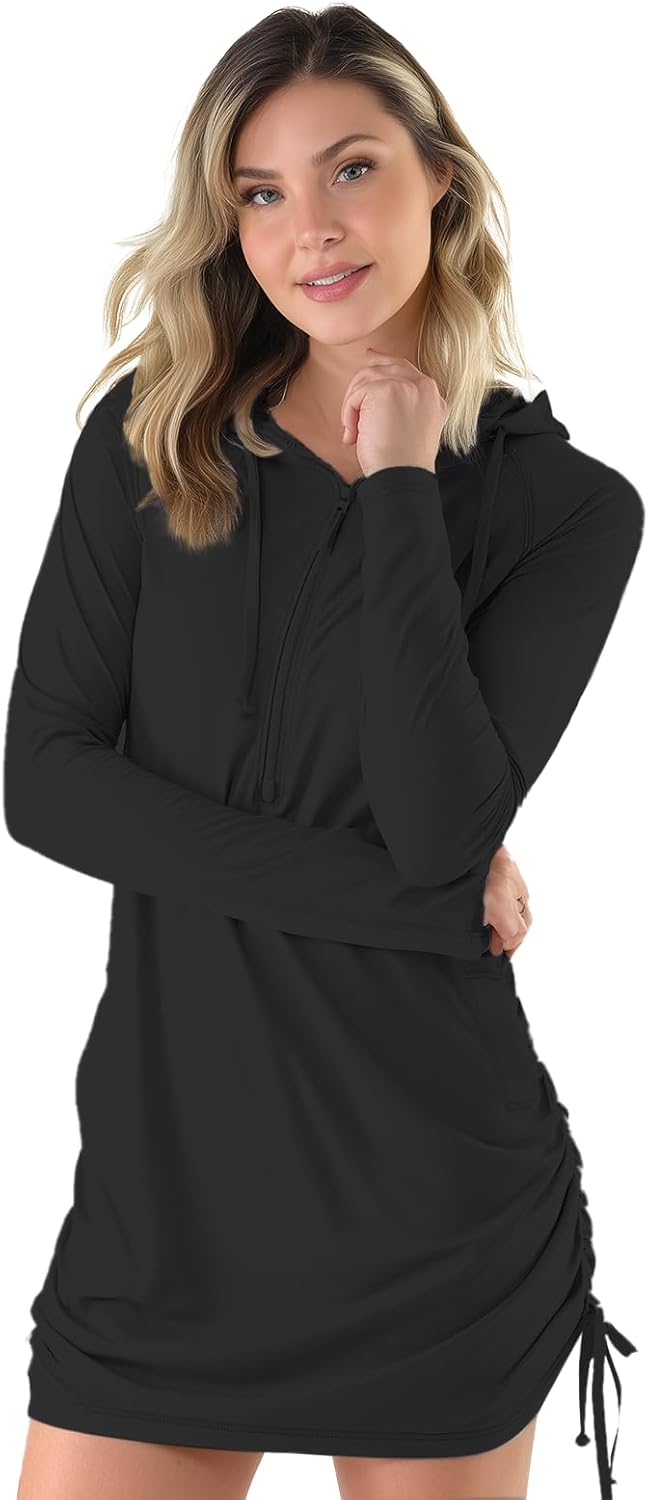 Palmyth Womens Swim Cover Up UPF 50+ Long Sleeve Hooded Dress with Pockets Sun Protection SPF Beach Coverup