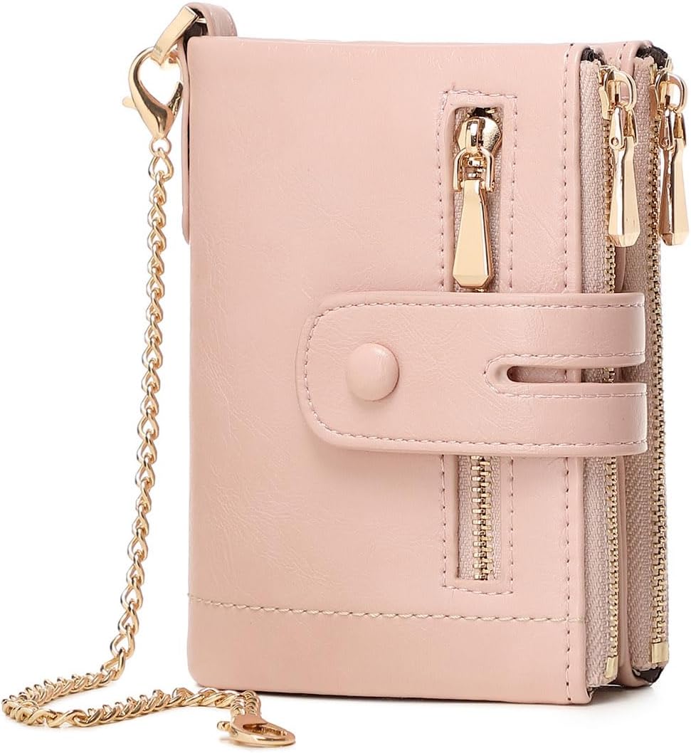 AOXONEL Wallets for Women Small Rfid Bifold Leather Ladies Wallet,Travel Billfolds Medium Size Card Holder with Removable Wristlet Chain,Multi-Card Slots,ID Window,Double Zipper Coin Pocket (Pink)