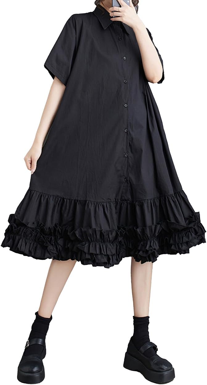 ellazhu Women's Shirt Dress Button Down Lapel Short Sleeve Ruffle Hem Oversize Loose Casual Solid GZ183 A