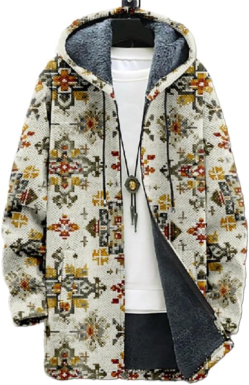 Mens Cardigan Sweatshirt Vintage Print Zip Up Fleece Sherpa Lining Hooded Jacket Warm Winter Long Coat with Pocket