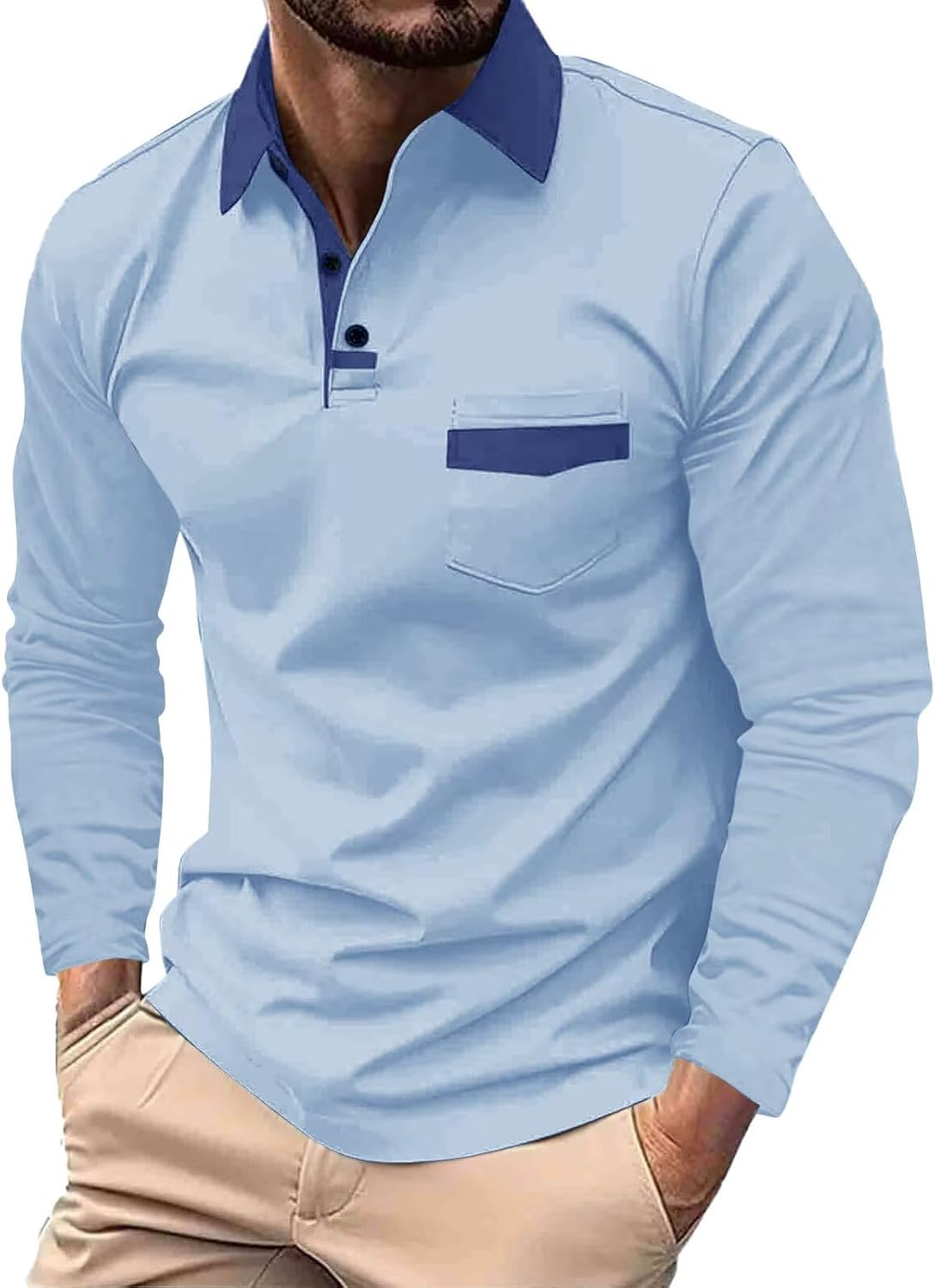 Men's Polo Shirts Long Sleeve 2025 Casual Polo T-Shirts Color Block Slim Fit Golf Polo Shirt with Pocket