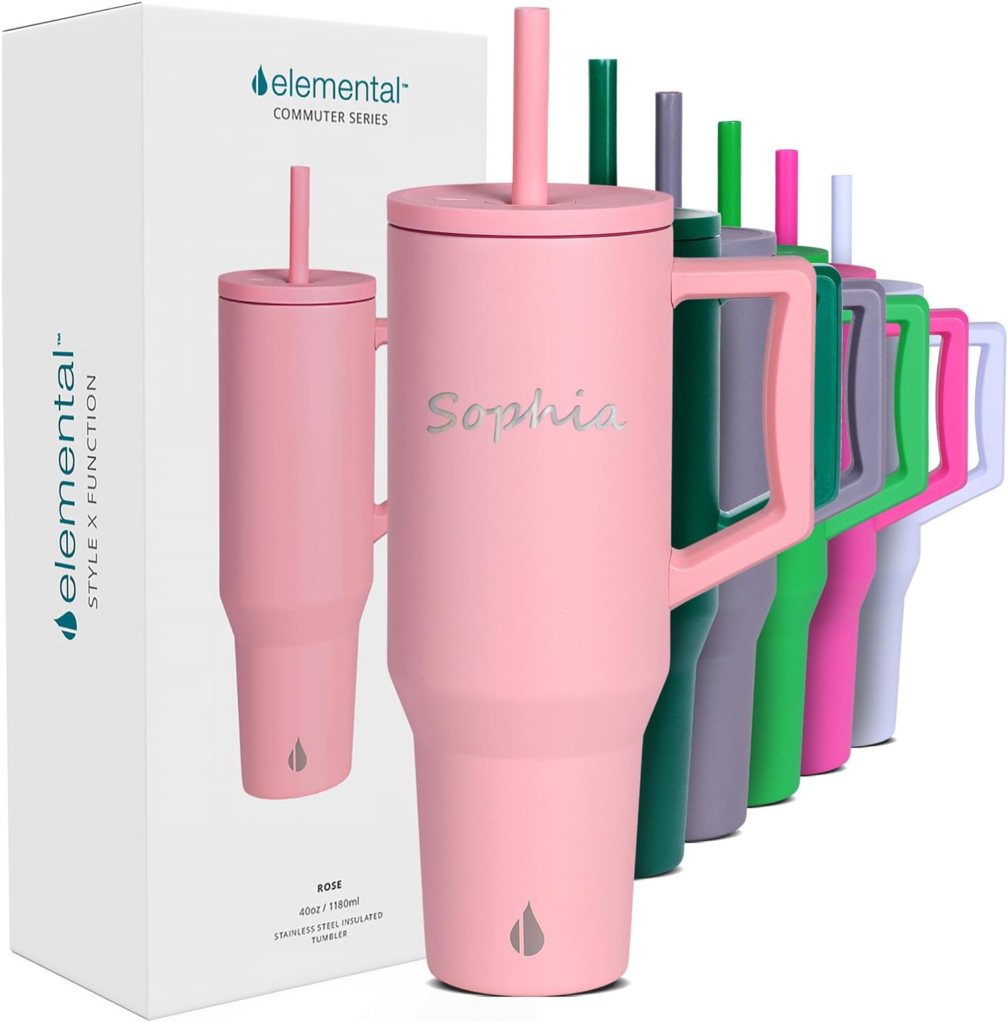 Elemental Personalized 40oz Tumbler with Handle and Straw - Custom Insulated Stainless Steel Commuter for Hot and Cold Beverages - Travel Coffee Mug with 2 Straws & Spill Proof Lid - Rose