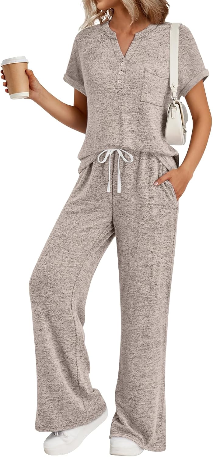 Trendy Queen 2 Piece Lounge Sets for Women Summer 2026 Henley Sweatsuit Travel Vacation Airport Outfits Pajamas Sets