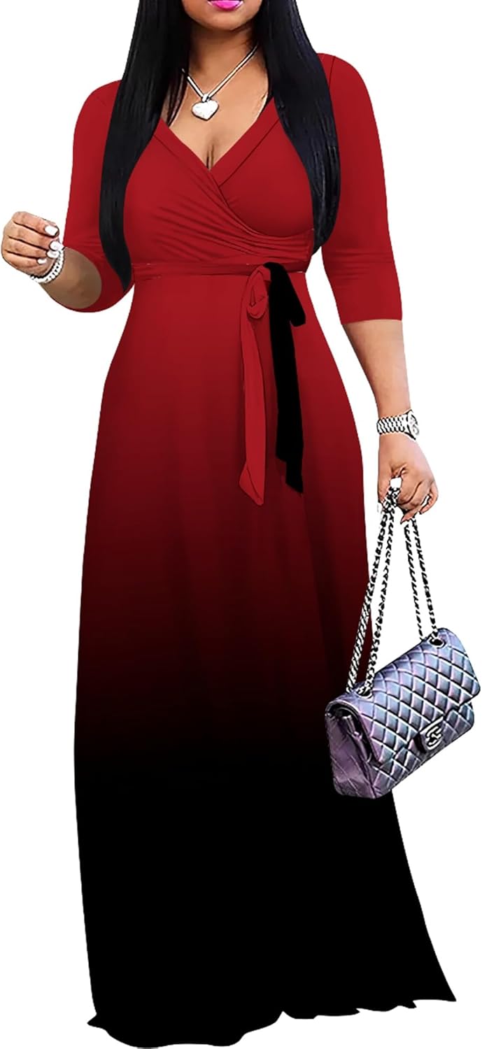 PinkPatty Women's Gradient Maxi Dress 3/4 Sleeves V Neck Cocktail Party Dress Belted Wrap Dresses(Gradients1 3XL)