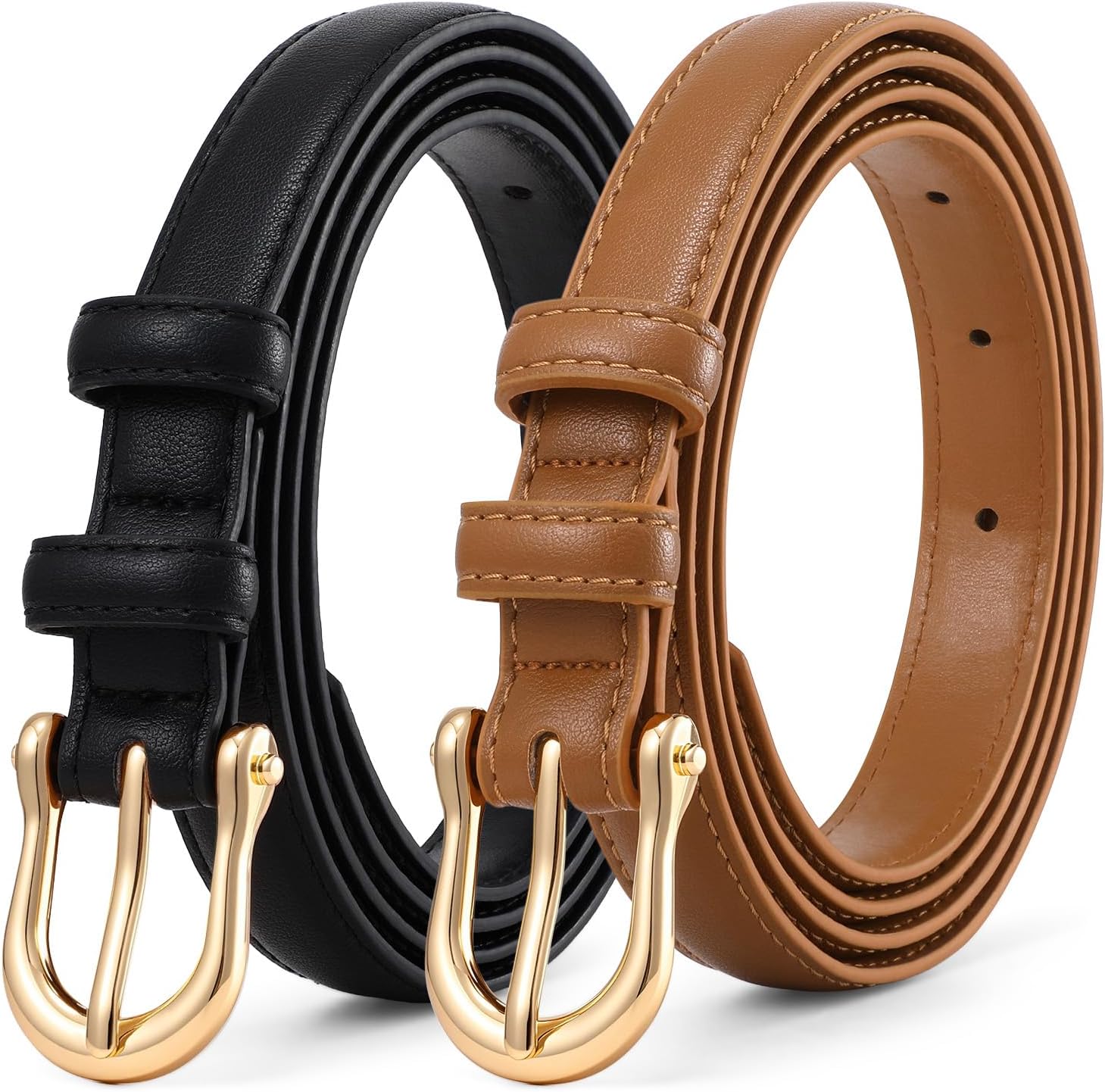 XZQTIVE 2Pack Thin Women Belt 0.7" Fashion Skinny Ladies Waist Belt for Jeans Pants Dress with Gold Buckle