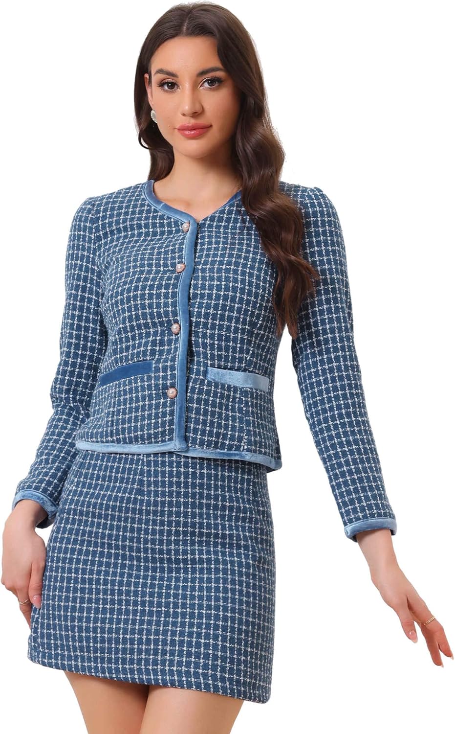 Allegra K Business Suit Set for Women's 2 Piece Outfits Plaid Tweed Easter Short Blazer Jacket and Skirt Sets