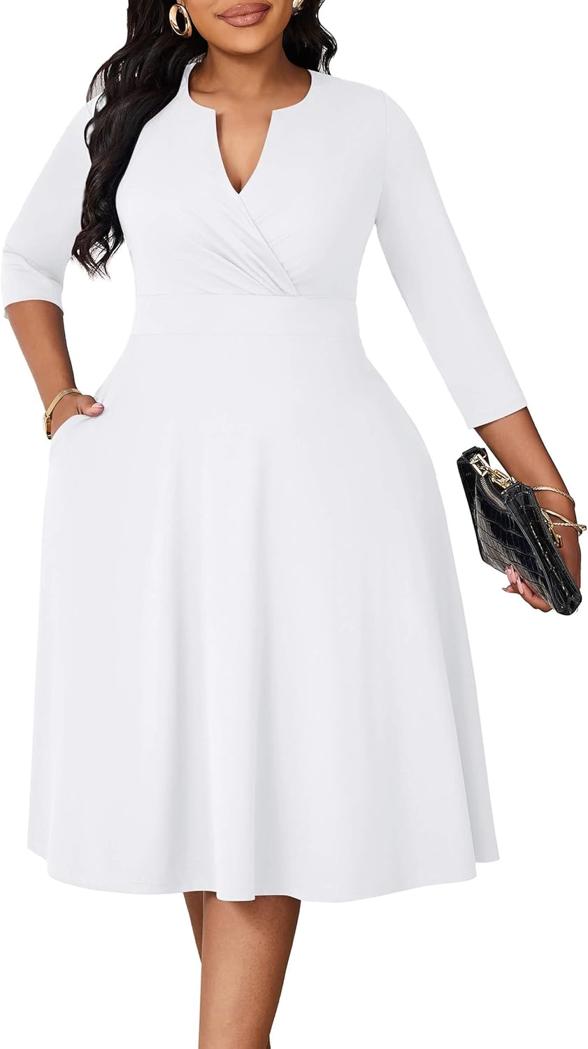 Runwind Women’s Plus Size Midi Dress 3/4 Sleeve Fit and Flare Cocktail Dresses Casual V-Neck Dress with Pockets