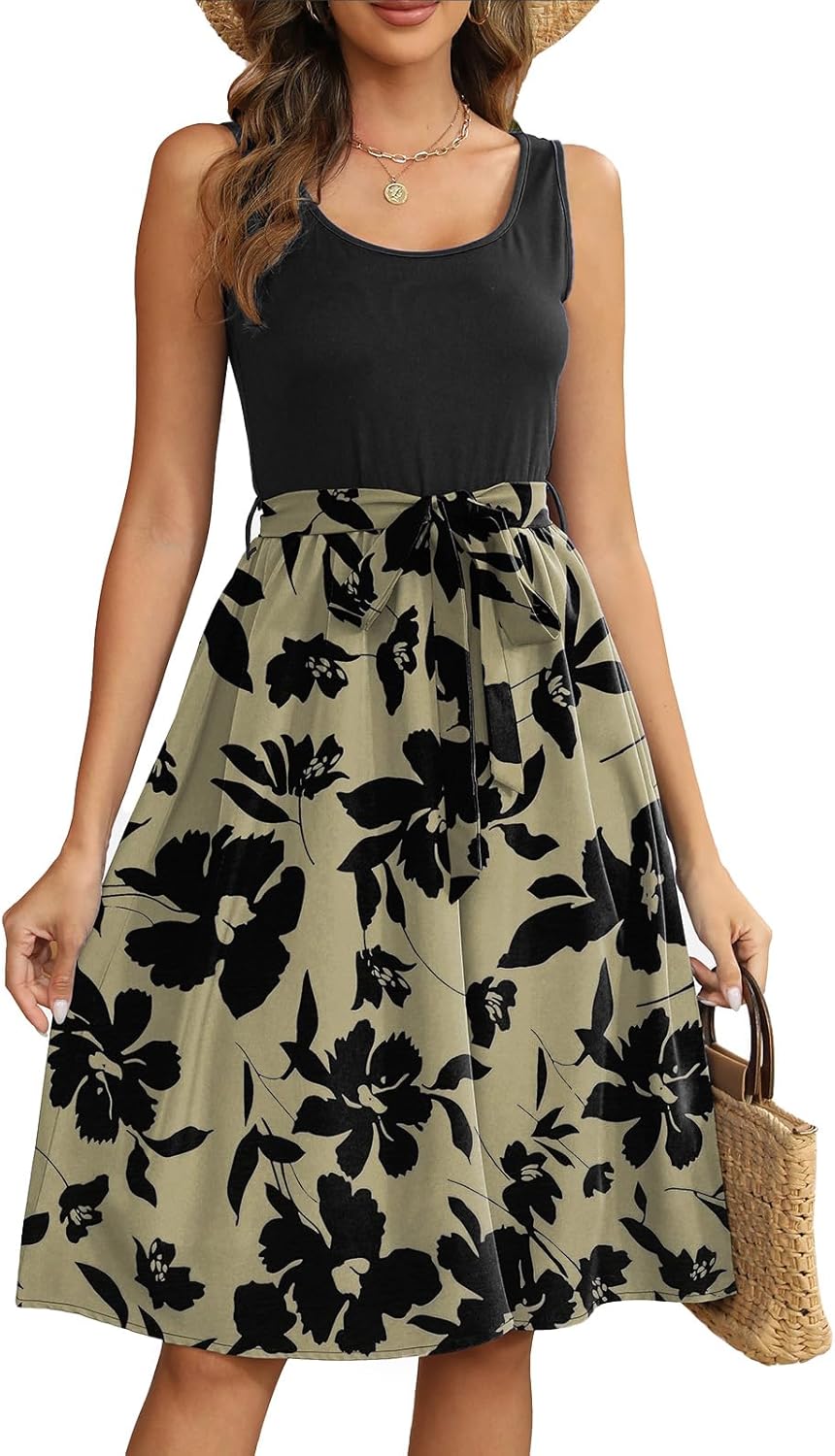MSLG Women's Casual Knee Length Dresses Summer Cute A-Line Sleeveless Beach Vacation Fit and Flare Sun Dress with Belt 808