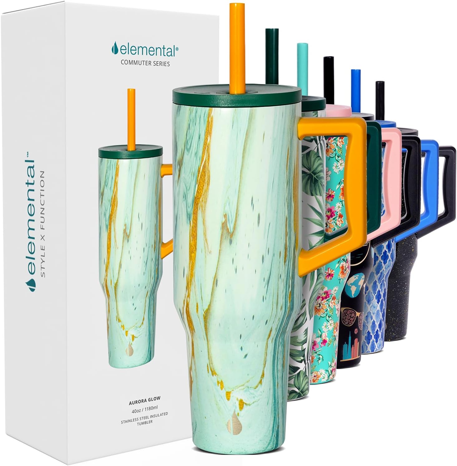 Elemental 40 oz Tumbler with Handle and Straw - Spill Proof Insulated Stainless Steel Commuter for Hot and Cold Beverages - Travel Coffee Mug with 2 Straws & Spill Proof Lid - 40oz - Aurora Glow