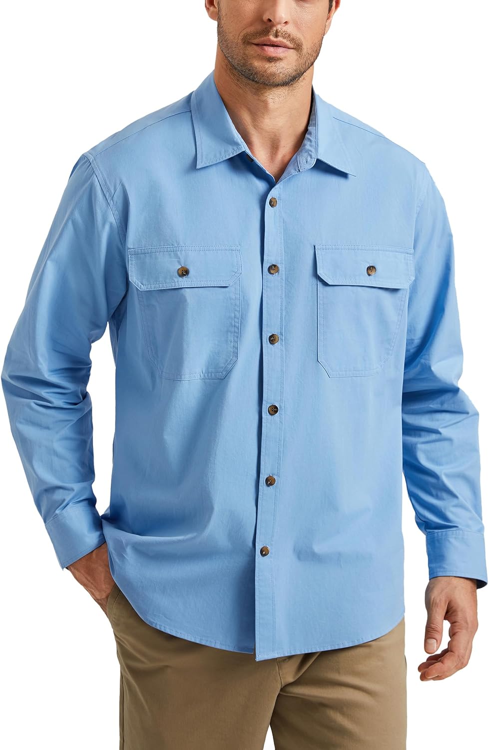 HISDERN 335 Men Long Sleeve Work Shirts with Two Pockets Cotton Button Down Up Shirt Casual Relaxed Fit Workshirt Man