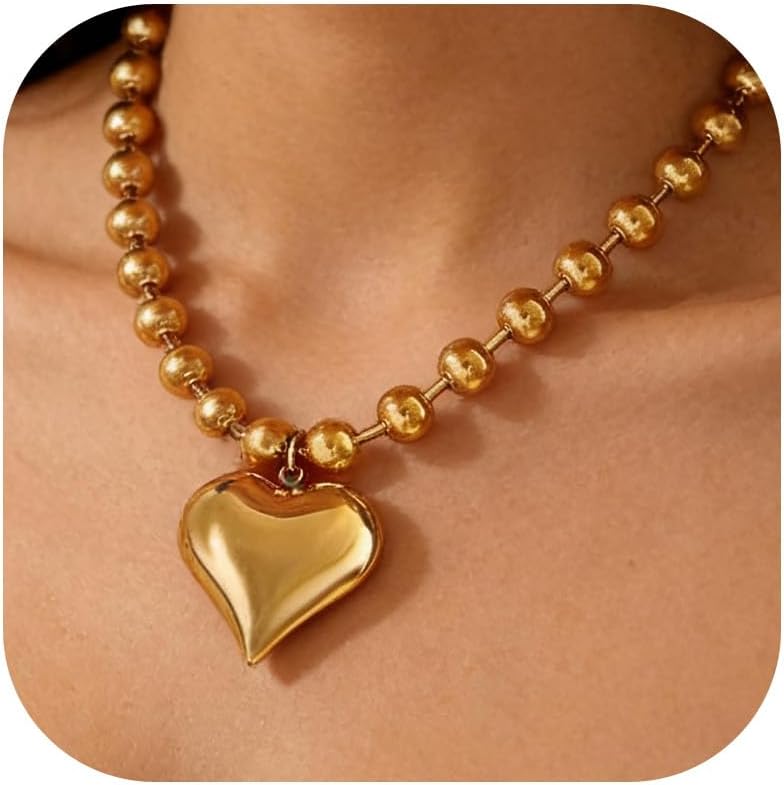Long tiantian Chunky Gold Necklace with Heart Star Pendant Puffy Charm Necklace for Women Chunky Beaded Chain Trendy Jewelry