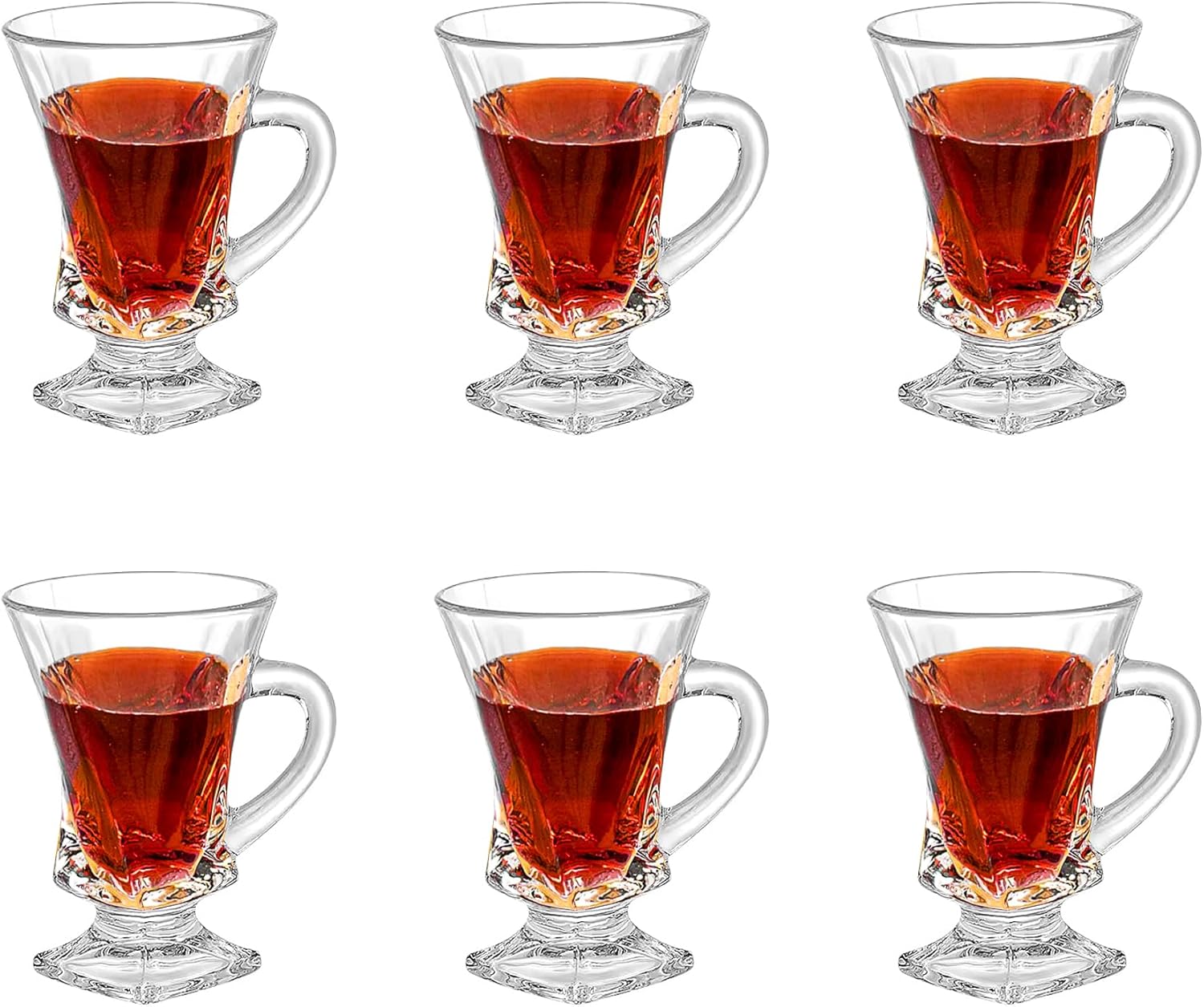 Turkish Tea Cups Set of 6 - Glass Tea Cups with Handle - 4.6 oz Small Clear Footed Coffee Mugs for Tea, Espresso Coffee, Hot Chocolate, Dishwasher Safe
