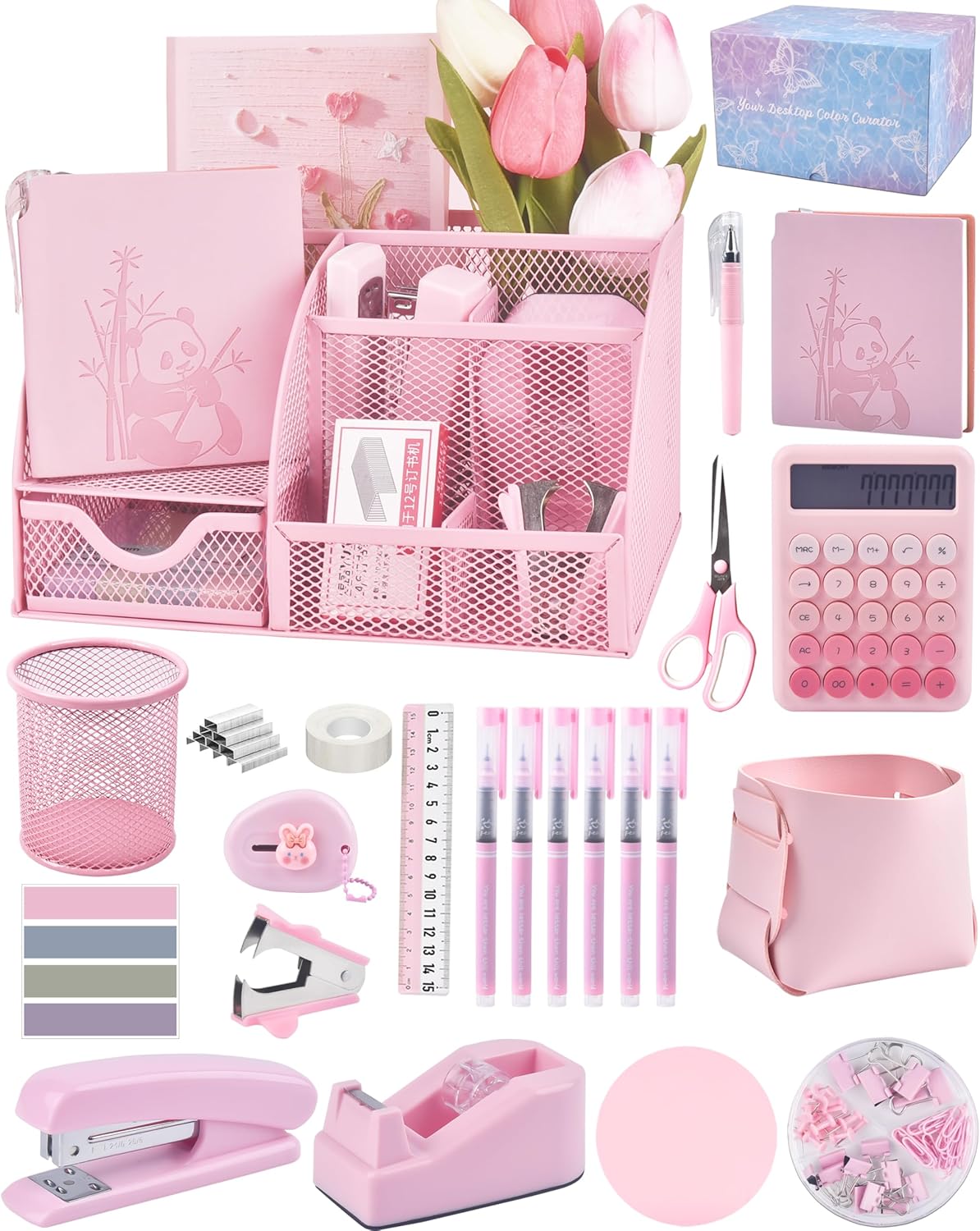 - All-in-One Pink Organization & Style: Elevate your workspace with this complete set of essential pink desk accessories! Features a 1 mesh desk organizer,1 Pen holder,1 calculator, 1 pen holder,1 clip Set(includespaper clips, large binders, small binders, pins), 1 stapler, 1,000 staples, 1 staple remover, 1 tape dispenser, 1 adhesive tape, 1 Pocket Book, 1 Pocket Pen, 1 pu leather organizer , 1 ruler, 1 scissors, 1 book of sticky notes,6 pen,1 scoaster