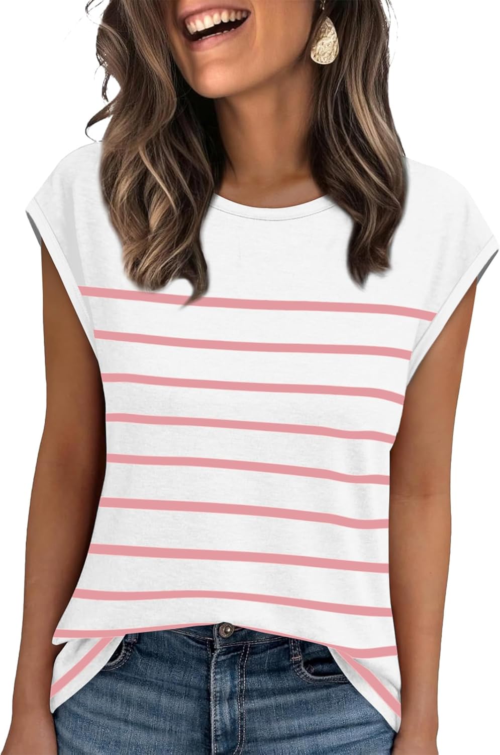 XIEERDUO Womens Tops Dressy Casual Summer Striped Shirts Cap Sleeve Tops Color Block Loose Fit