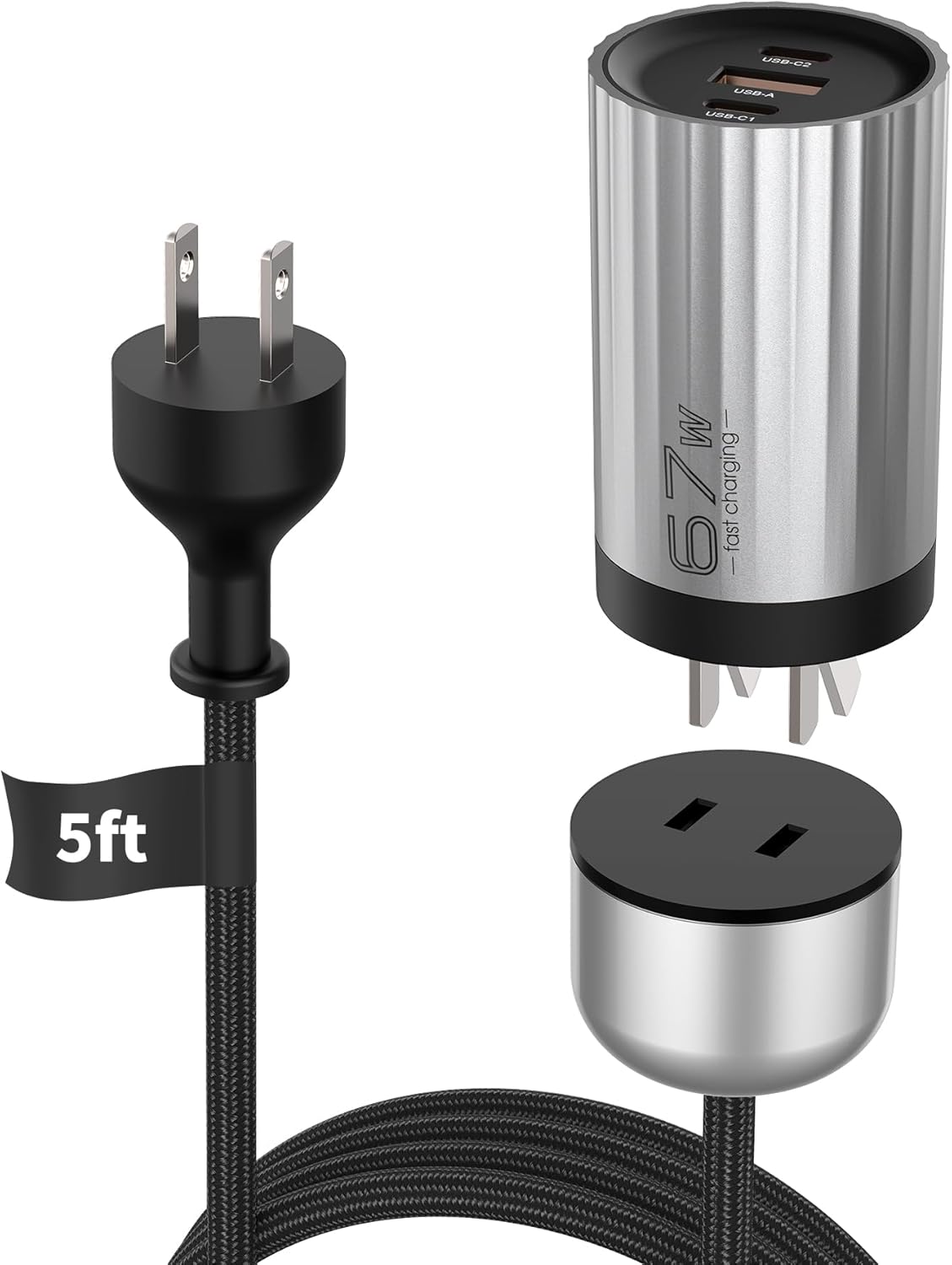 - Included Components: 3-Port GaN Wall Charger Block with 2 USB-C & 1 USB-A Port, Detachable Outlet with 5ft Nylon Extension Cord