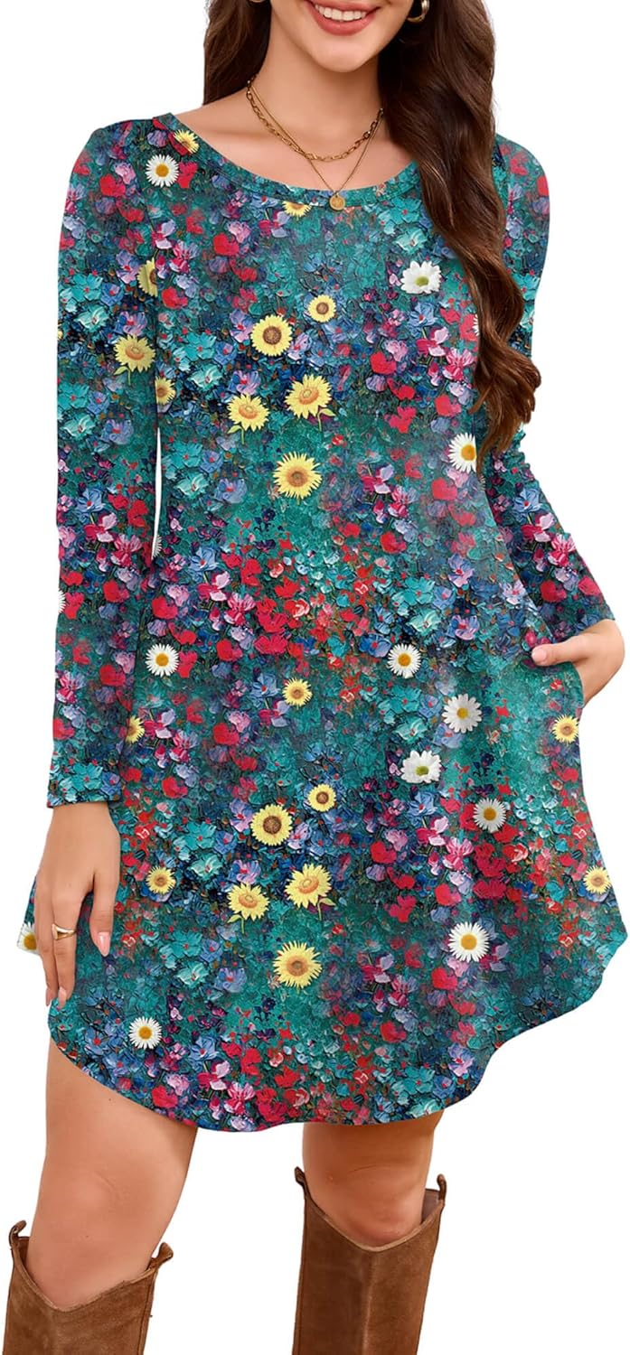 DEARCASE Women's Long Sleeve T Shirt Dress Crewneck Knee Length Loose Casual Flowy Swing Tunic Dresses with Pockets