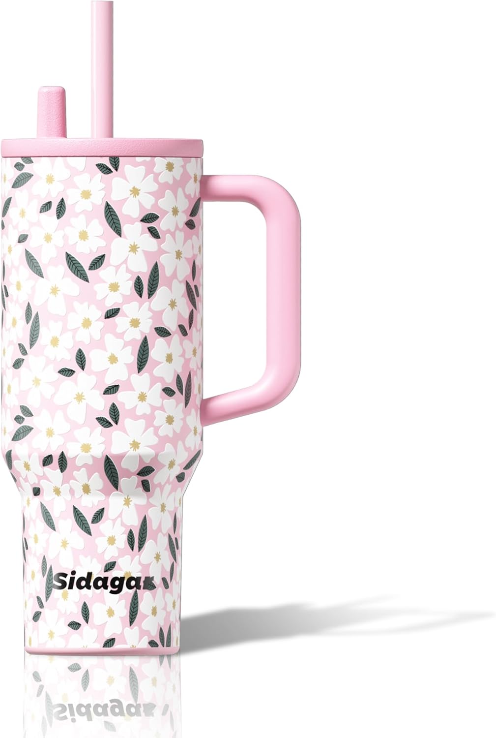 40 oz Stainless Steel Tumbler with Handle, Insulated Coffee Travel Mug, Resuable Spill Proof Water Bottle for Women, Flower