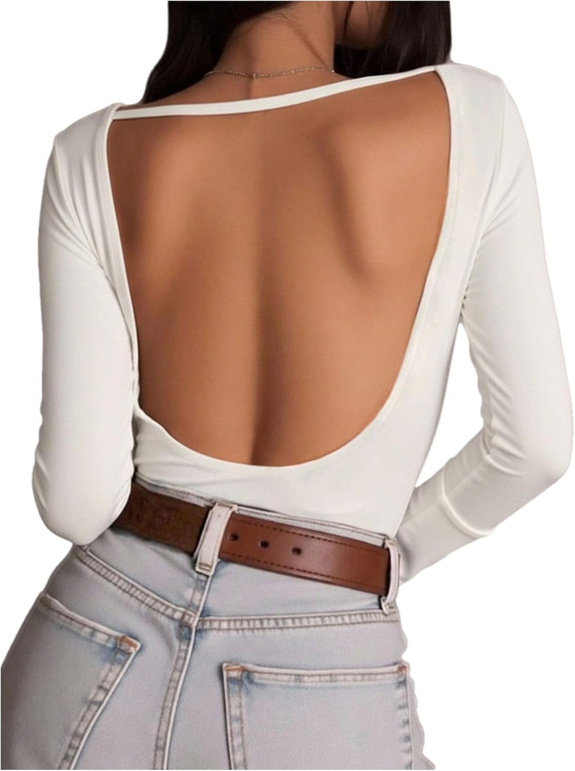 SHENHE Women's Open Back Scoop Neck T Shirt Sexy Long Sleeve Solid Fitted Going Out Tees