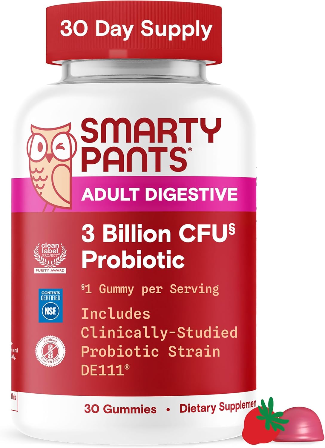 - SCIENCE-BACKED PROBIOTIC GUMMY SUPPLEMENT FOR ADULTS: SmartyPants 3 Billion CFU Probiotic is specifically formulated multi-strain probiotic supplement with clinically-studied DE111 to support a balanced gut microbiome, immune system, and digestive health* and with LactoSpore in a delicious gummy serving.
