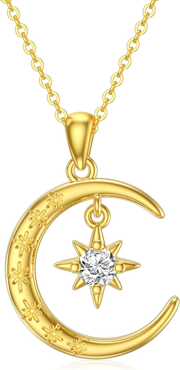 DOVRAN 14K Yellow Gold Moon Star/Sun Necklace for Women Solid Real Gold Moissanite/Opal Pendant Jewelry Christmas Gifts for Wife Mom