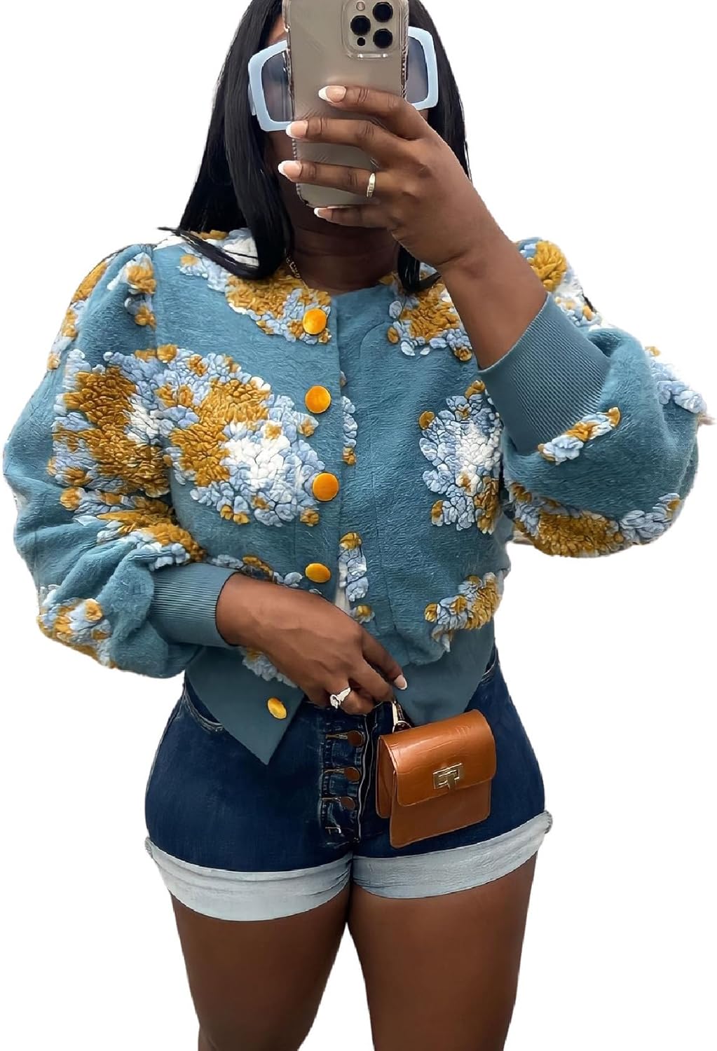 Womens Cropped Floral Print Jacket Warm Fleece Bomber Jacket Casual Button Down Coats Fall Puff Outerwears