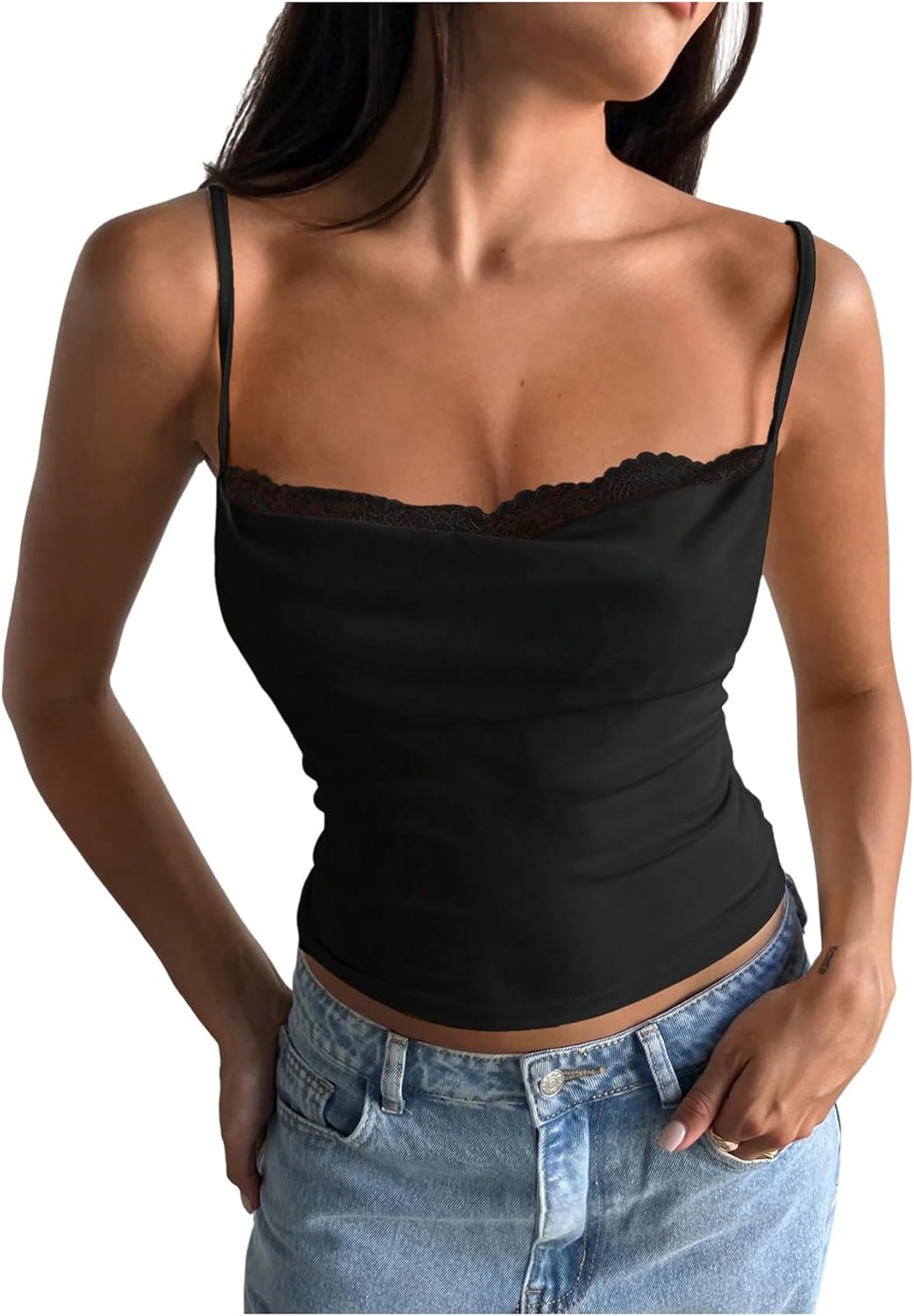 Milumia Women's Cowl Neck Lace Cami Top Y2K Tie Backless Sleeveless Spaghetti Strap Going Out Tops