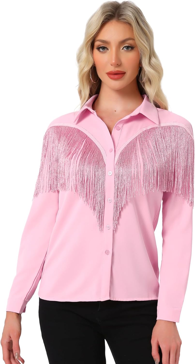 Allegra K Women's Western Fringe Blouse Long Sleeve Button Down Disco Cowgirl Shirts
